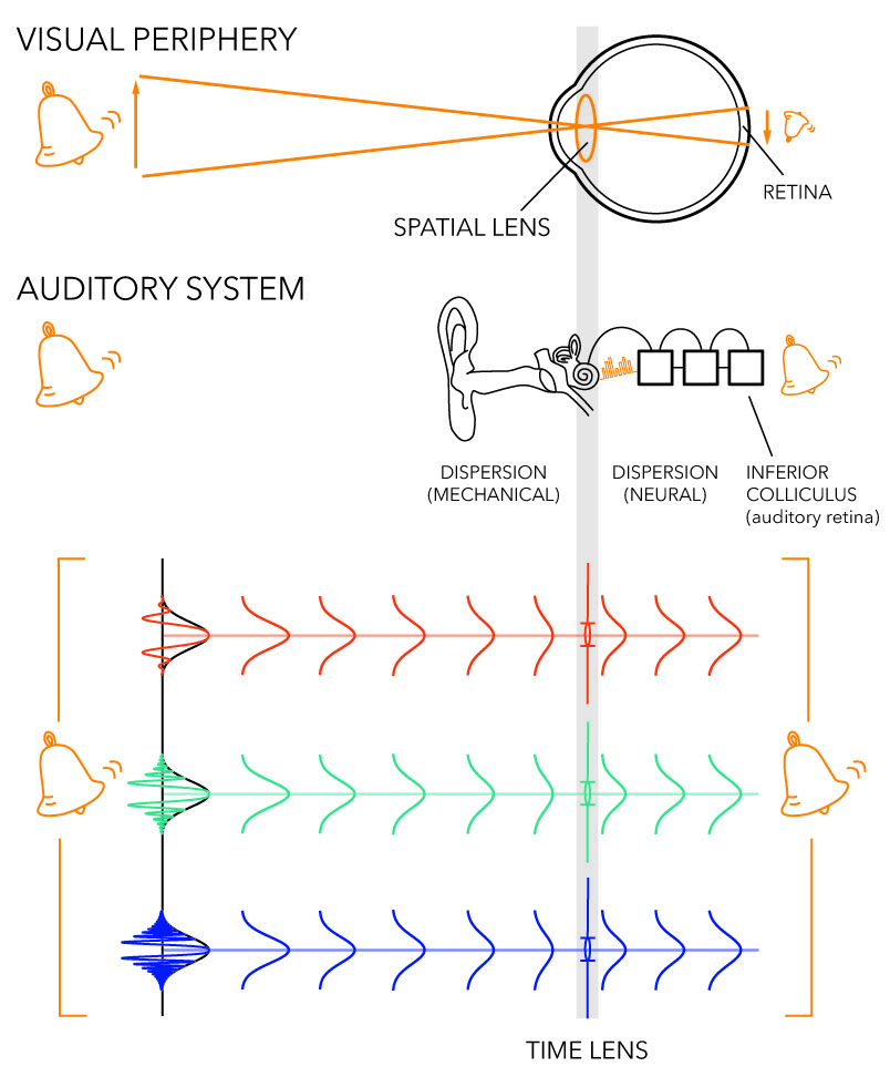 The second speculative step is to identify a lens. A temporal imaging system requires a "time lens", rather than a spatial lens, although it is not strictly necessary (this is because a pinhole camera does not have a lens, but still produces a sharp image, as long as the aperture is very small). A time lens performs the same mathematical operation as the spatial lens in the eye, only over one dimension of time instead of over two dimensions of space, and where frequency is a variable rather than a constant (Point 3). Indeed, an inspection of the dynamic properties of the organ of Corti that were recorded in several state-of-the-art physiological measurements reveals a phase dependence in time, frequency, and space that is symmetrical in shape. Such phase response can be readily attributed to a time lens, which is modeled using a quadratic phase function—a form of phase modulation.